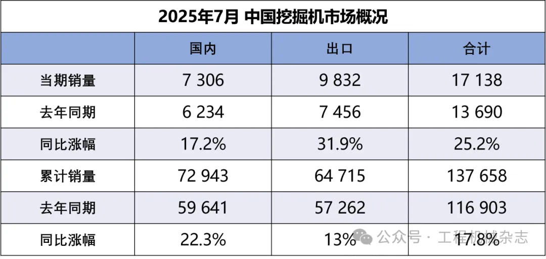 日前,中国工程机械工业协会发布数据,7月份,国内挖掘机主要制造企业销售各类挖掘机17138台,同比增长25.2%。其中国内销量7306台,同比增长17.2%,出口量9832台,同比增长31.9%,挖掘机月平均工作时长为66.1小时,月…......